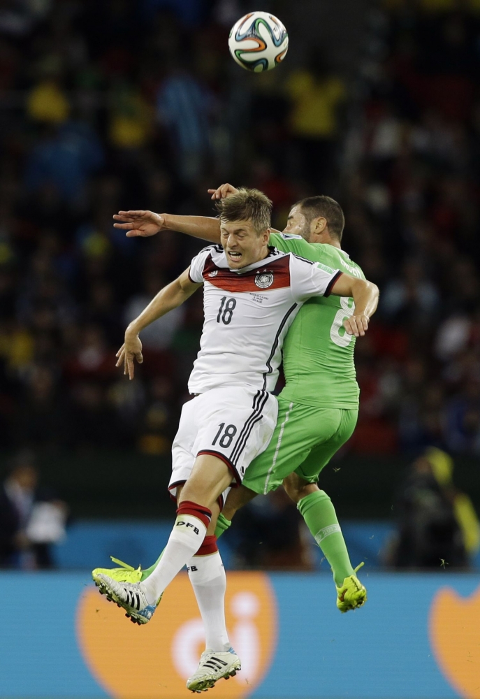 Alžírčan Medhi Lacen v súboji s nemeckým futbalistom Tonim Kroosom počas pondelňajšieho osemfinálového zápasu na svetovom šampionáte v Brazílii. Foto: SITA/AP