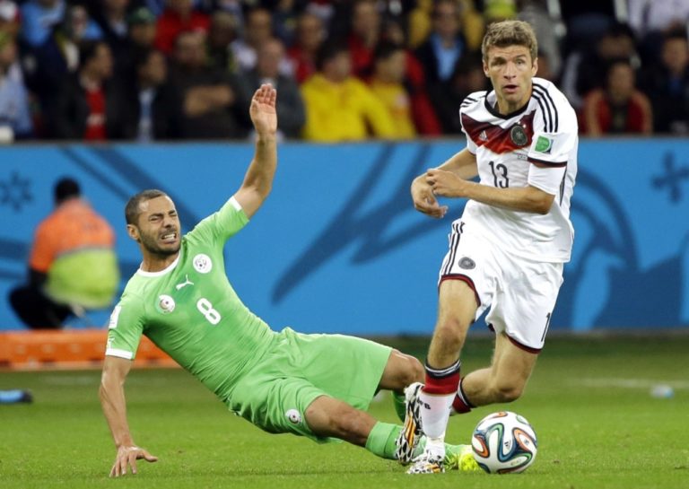 Alžírčan Rafik Halliche v súboji s nemeckým futbalistom Thomasom Müllerom počas pondelňajšieho osemfinálového zápasu na svetovom šampionáte v Brazílii. Foto: SITA/AP
