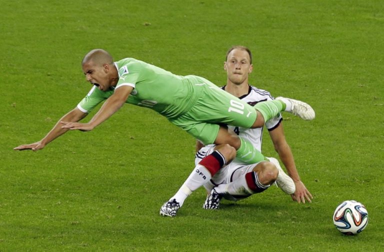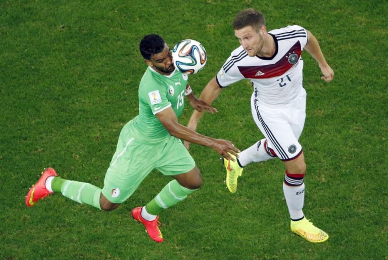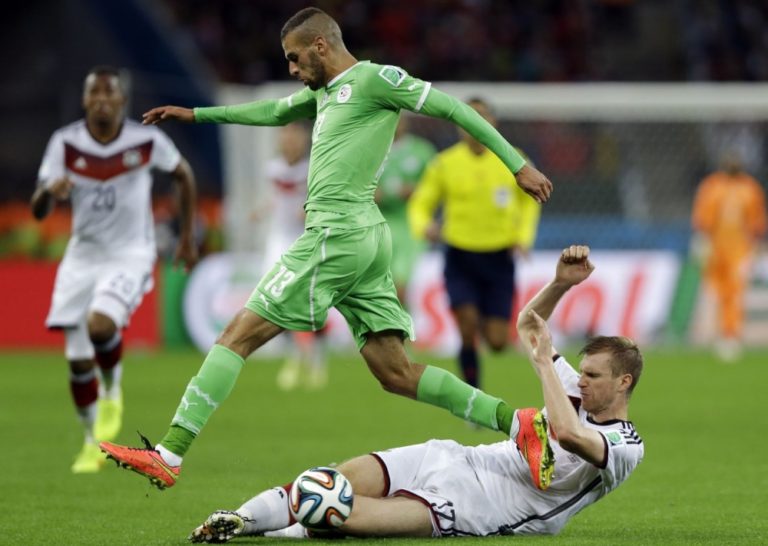 Alžírčan El Arbi Hillel Soudani v súboji s nemeckým futbalistom Shkodranom Mustafim počas pondelňajšieho osemfinálového zápasu na svetovom šampionáte v Brazílii. Foto: SITA/AP