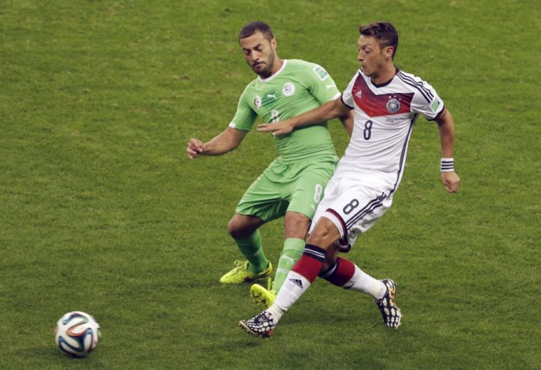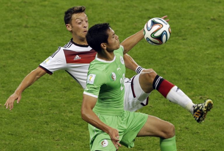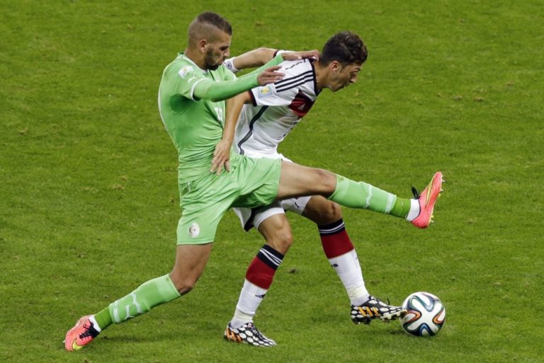 Alžírčan Islam Slimani v súboji s nemeckým futbalistom Mesutom Özilom počas pondelňajšieho osemfinálového zápasu na svetovom šampionáte v Brazílii. Foto: SITA/AP