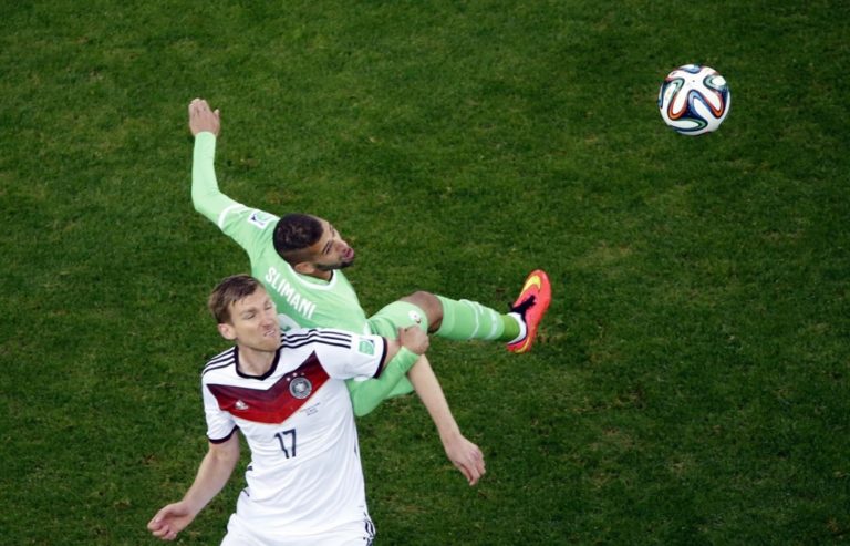 Alžírčan Islam Slimani v súboji s nemeckým futbalistom Perom Mertesackerom počas pondelňajšieho osemfinálového zápasu na svetovom šampionáte v Brazílii. Foto: SITA/AP