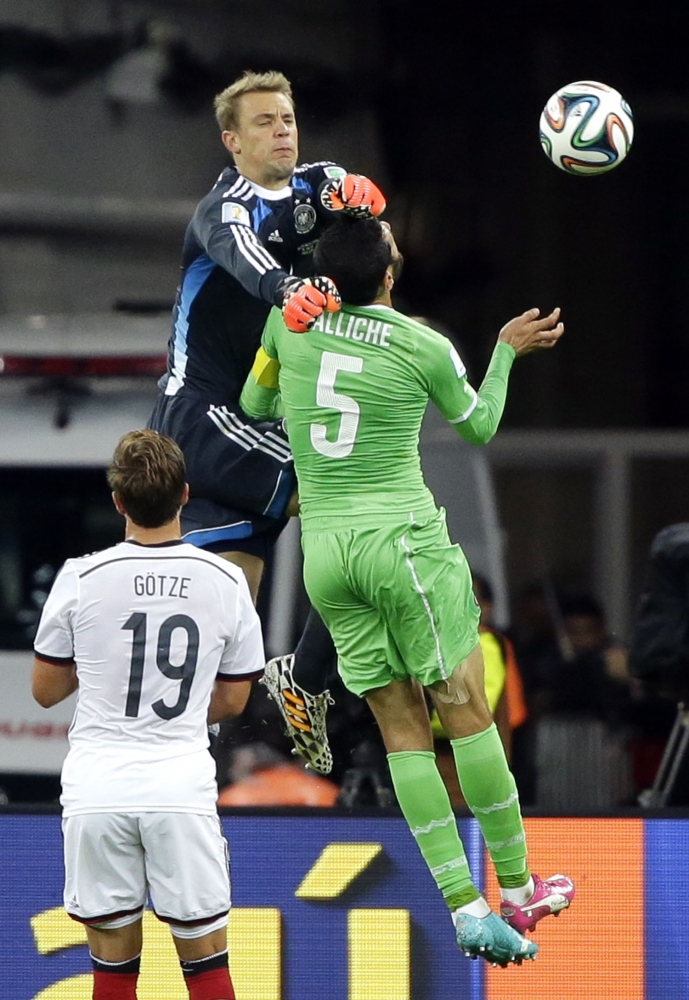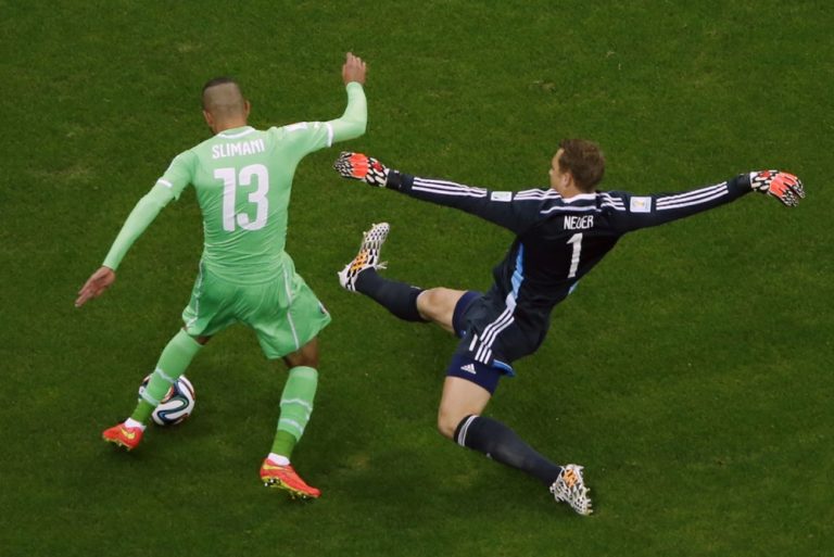 Nemecký brankár Manuel Neur zasahuje proti Alžírčanovi Islamovi Slimanimu počas pondelňajšieho osemfinálového zápasu na svetovom šampionáte v Brazílii. Foto: SITA/AP