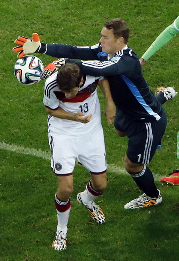 Zrážka nemeckého útočníka Thomasa Müllera s brankárom Manuelom Neuerom počas pondelňajšieho osemfinálového zápasu na svetovom šampionáte v Brazílii. Foto: SITA/AP