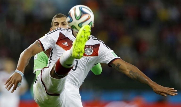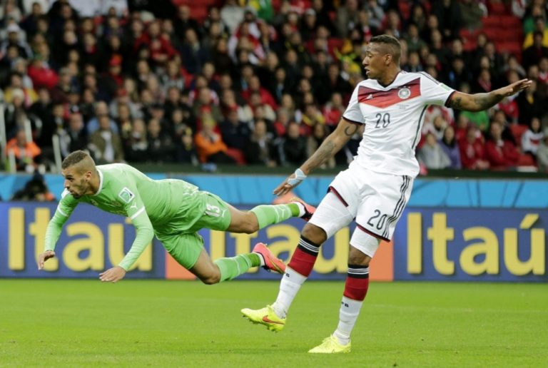 Nemecký futbalista Jerome Boateng v súboji s Alžírčanom Islamom Slimanim počas pondelňajšieho osemfinálového zápasu na svetovom šampionáte v Brazílii. Foto: SITA/AP