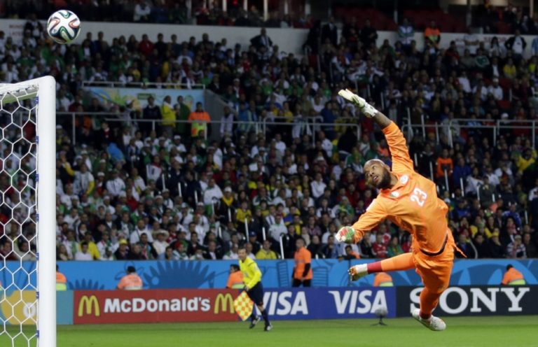 Zákrok alžírskeho brankára Raisa M’Bolhia po strele jedného z nemeckých futbalistov počas pondelňajšieho osemfinálového zápasu na svetovom šampionáte v Brazílii. Foto: SITA/AP
