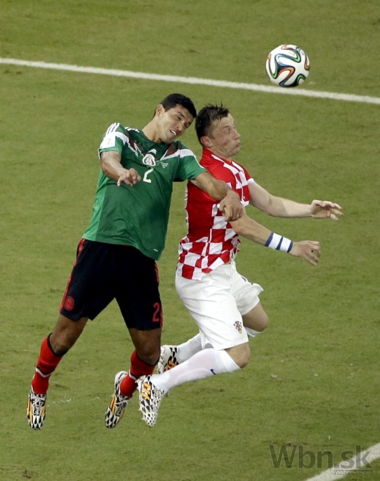 Mexičan Miguel Layun v súboji s chorvátskym futbalistom Darijom Srnom počas pondelňajšieho zápasu na svetovom šampionáte v Brazílii. Foto: SITA/AP