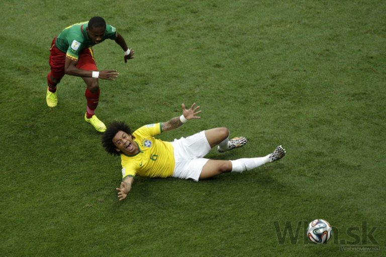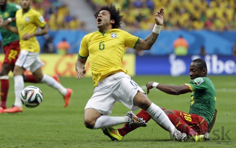 Kamerunčan Eyong Enohpočas fauluje brazílskeho futbalistu Marcela počas pondelňajšieho zápasu A-skupiny na svetovom šampionáte. Foto: SITA/AP