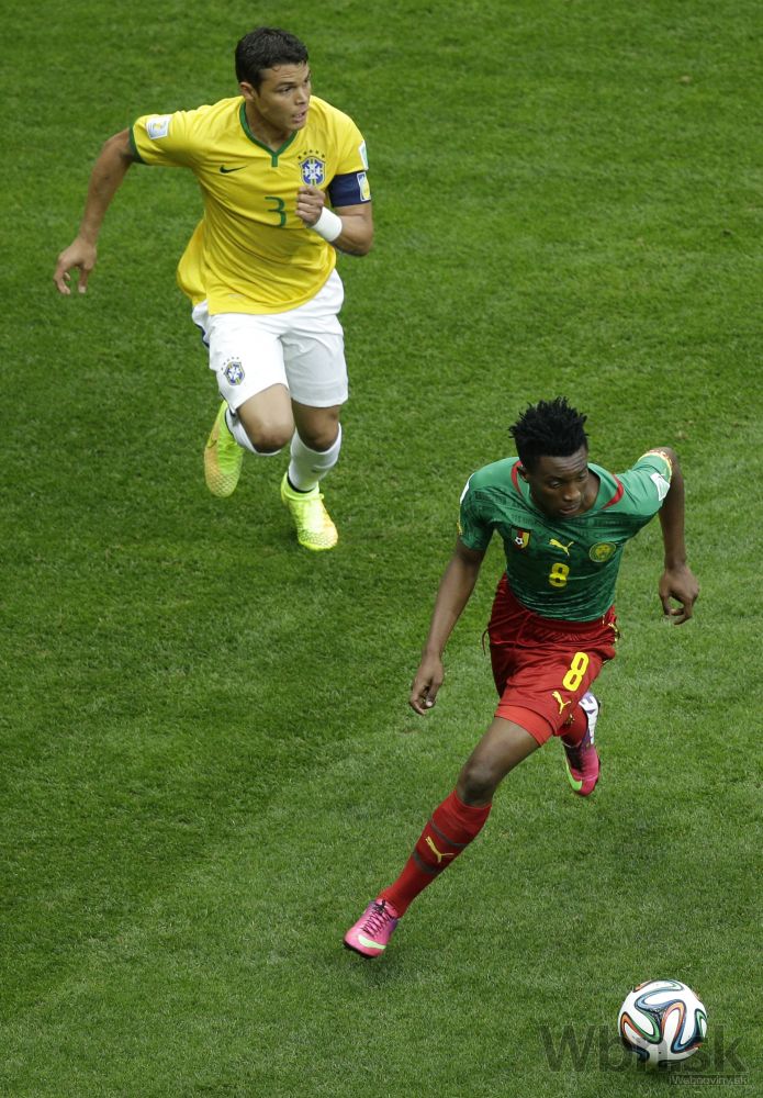 Kamerunčan Benjamin Moukandjo v súboji s brazílskym futbalistom Thiagom Silvom počas pondelňajšieho zápasu A-skupiny na svetovom šampionáte v Brazílii. Foto: SITA/AP