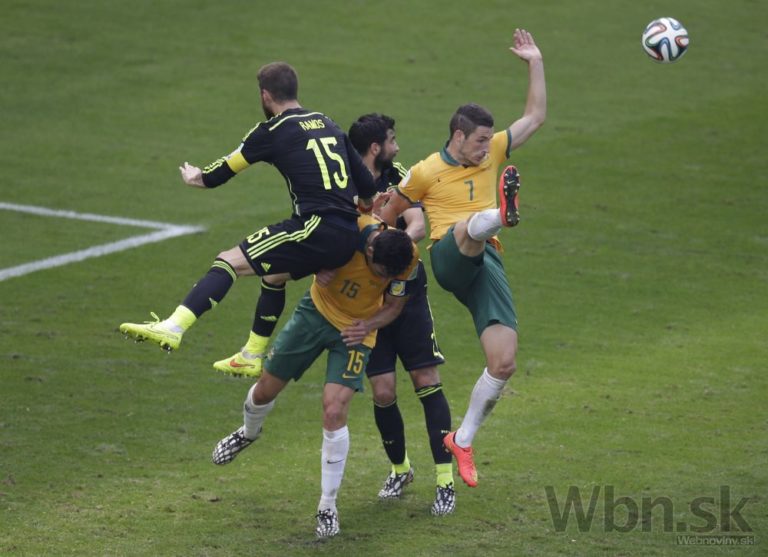 Hlavičkový súboj futbalistov Austrálie a Španielska počas pondelňajšieho zápasu B-skupiny na svetovom šampionáte v Brazílii. Foto: SITA/AP