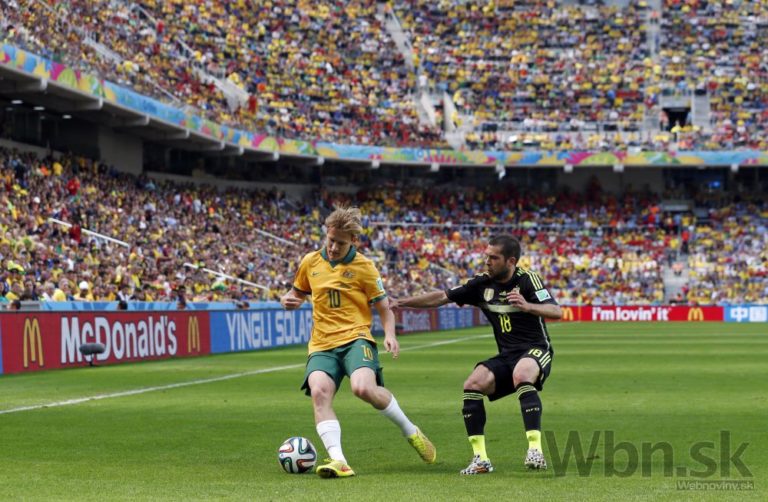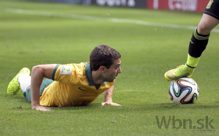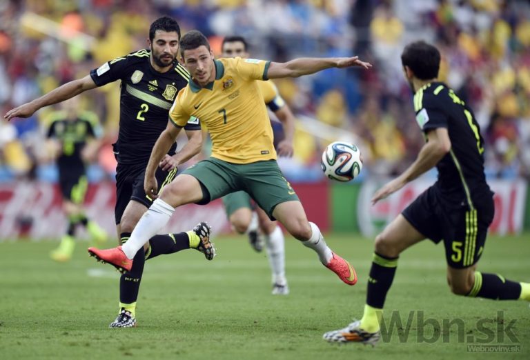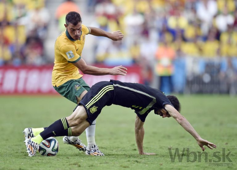 Austrálčan Mathew Leckie v súboji so španielskymi futbalistami počas pondelňajšieho zápasu B-skupiny na svetovom šampionáte v Brazílii. Foto: SITA/AP