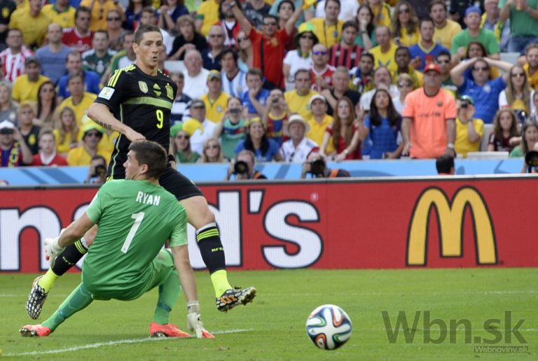 Španielsky útočník Fernando Torres prekonáva austrálskeho brankára Mata Ryana počas pondelňajšieho zápasu B-skupiny na svetovom šampionáte v Brazílii. Foto: SITA/AP