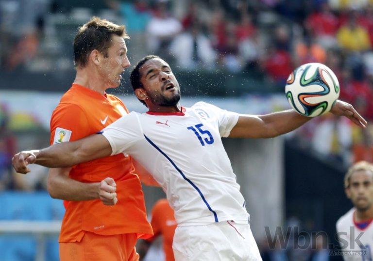 Čiľan Jean Beausejour v súboji s holandským futbalistom Stefanom de Vrijom počas pondelňajšieho zápasu B-skupiny na svetovom šampionáte v Brazílii. Foto: SITA/AP