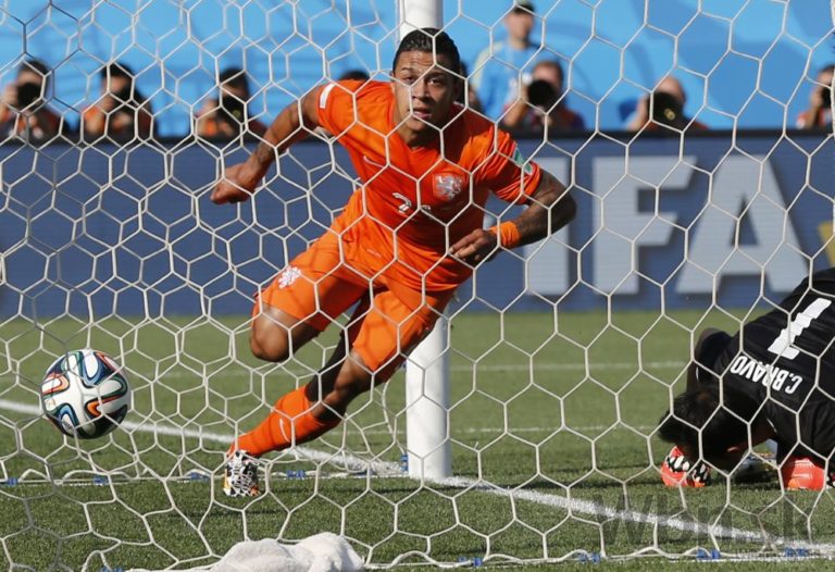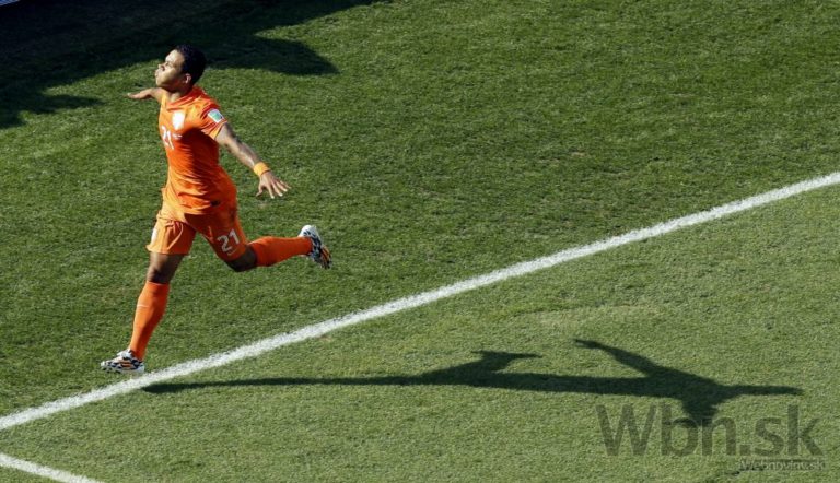 Holandský futbalista Memphis Depay sa raduje z gólu v sieti Čile počas pondelňajšieho zápasu na svetovom šampionáte v Brazílii. Foto: SITA/AP