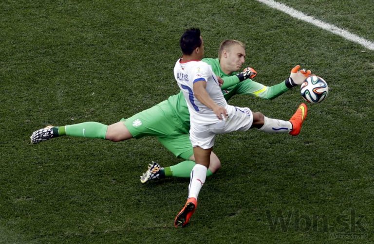 Čiľan Alexis Sanchez (7) v súboji sa snaží prekonať holandského brankára Jaspera Cillessena počas pondelňajšieho zápasu B-skupiny na svetovom šampionáte v Brazílii. Foto: SITA/AP