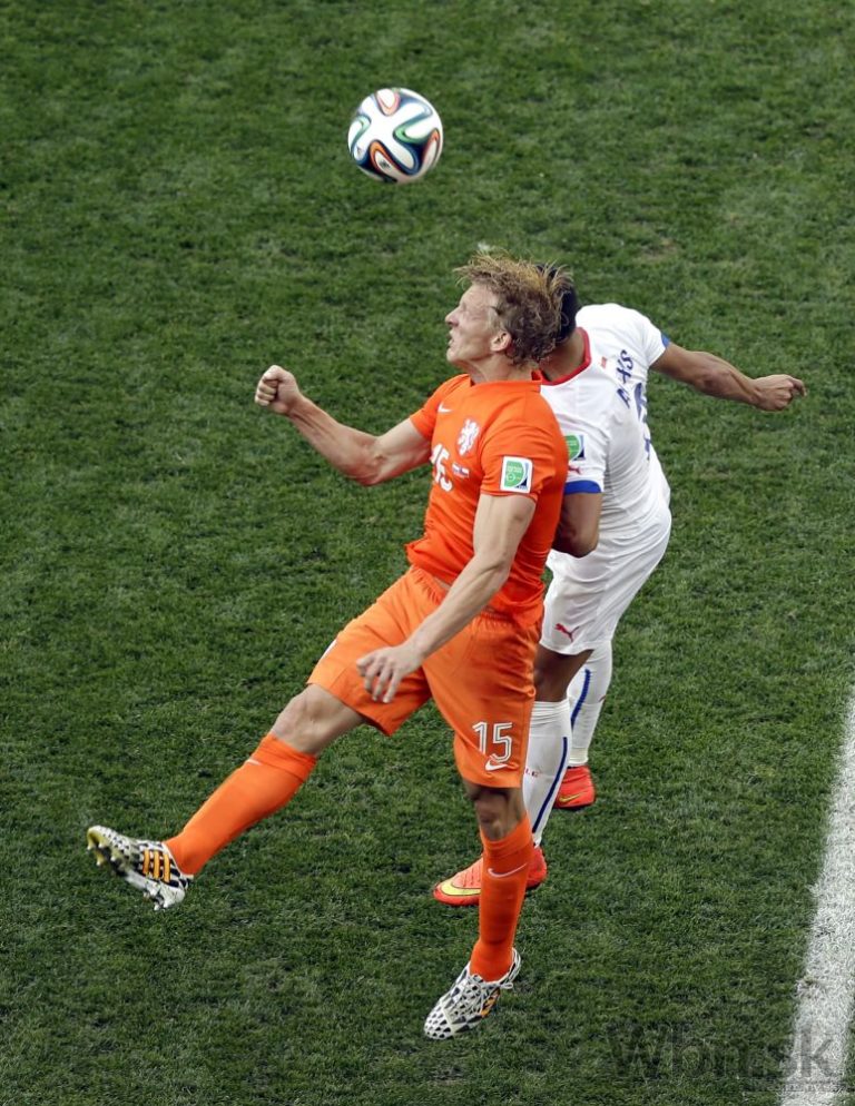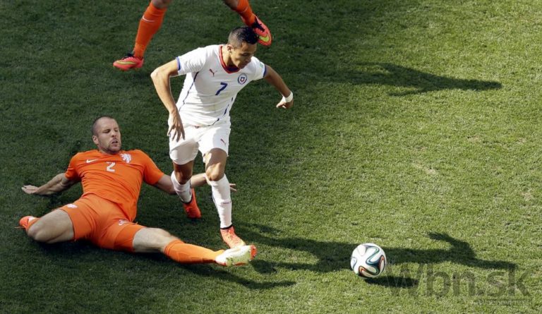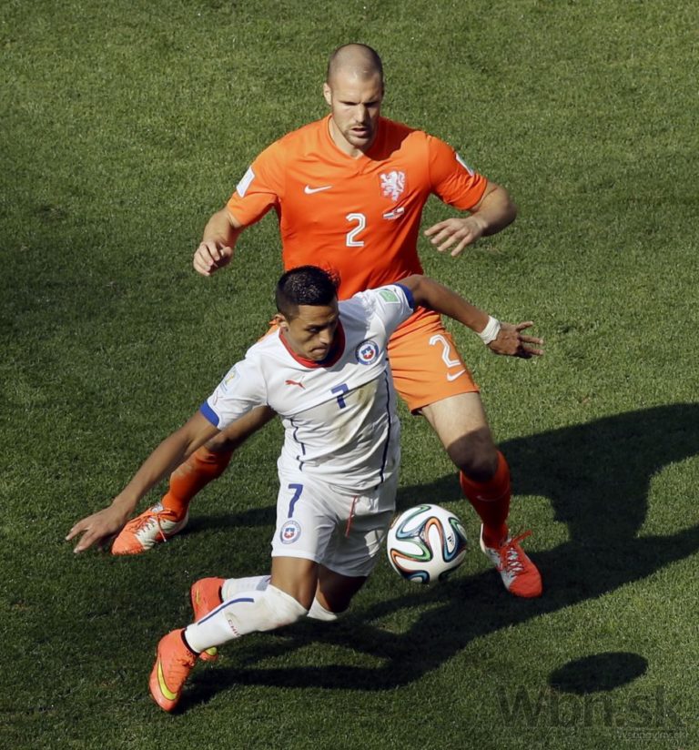 Čiľan Alexis Sanchez (7) v súboji s holandským futbalistom Daleyom Blindom (5) počas pondelňajšieho zápasu B-skupiny na svetovom šampionáte v Brazílii. Foto: SITA/AP