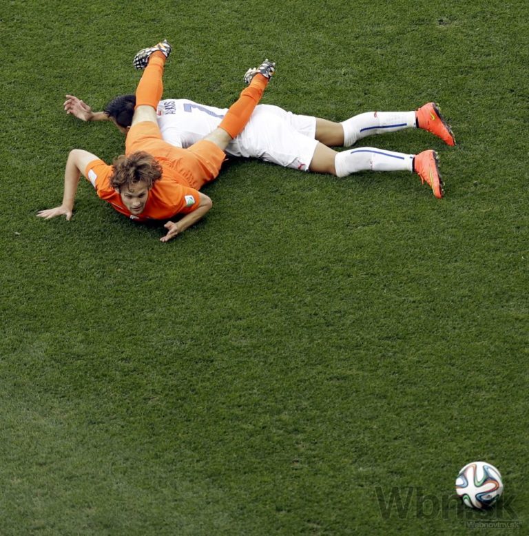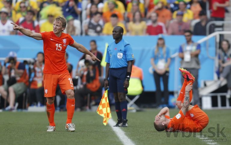 Holandský futbalista Dirk Kuyt ukazuje hlavnému rozhodcovi, že na trávniku leží zranený jeho spoluhráč Wesley Sneijder počas pondelňajšieho zápasu B-skupiny na svetovom šampionáte v Brazílii. Foto: SITA/AP