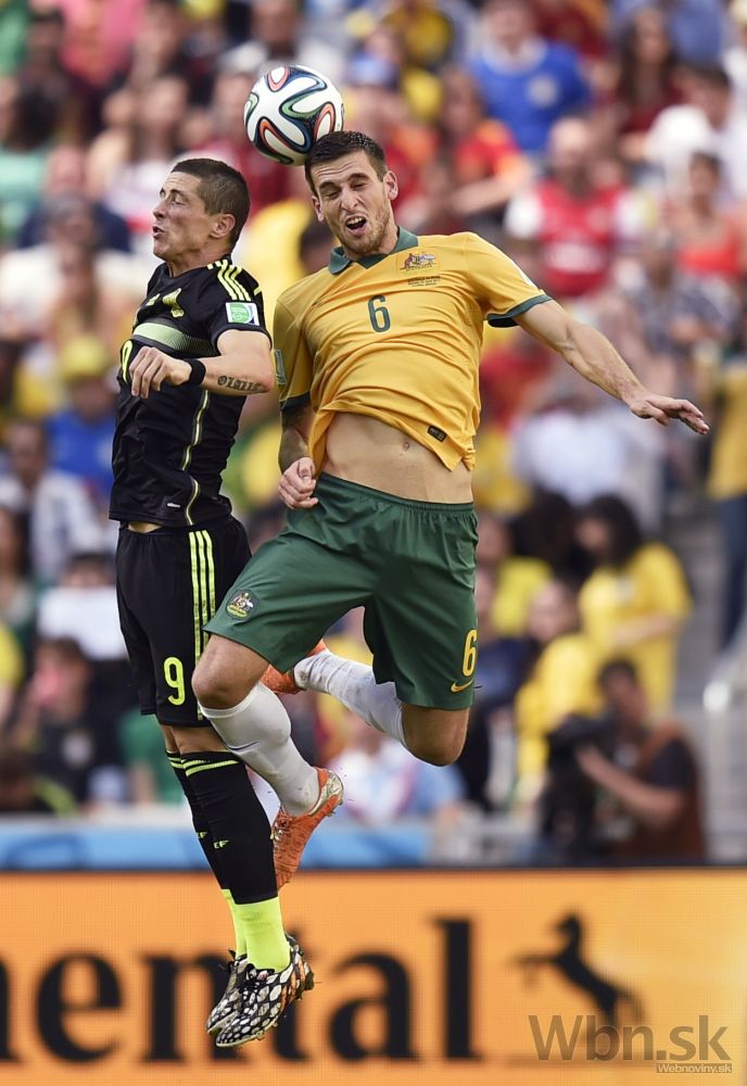 Austrálčan Matthew Spiranovic v súboji so španielskym futbalistom Fernandom Torresom počas pondelňajšieho zápasu B-skupiny na svetovom šampionáte v Brazílii. Foto: SITA/AP