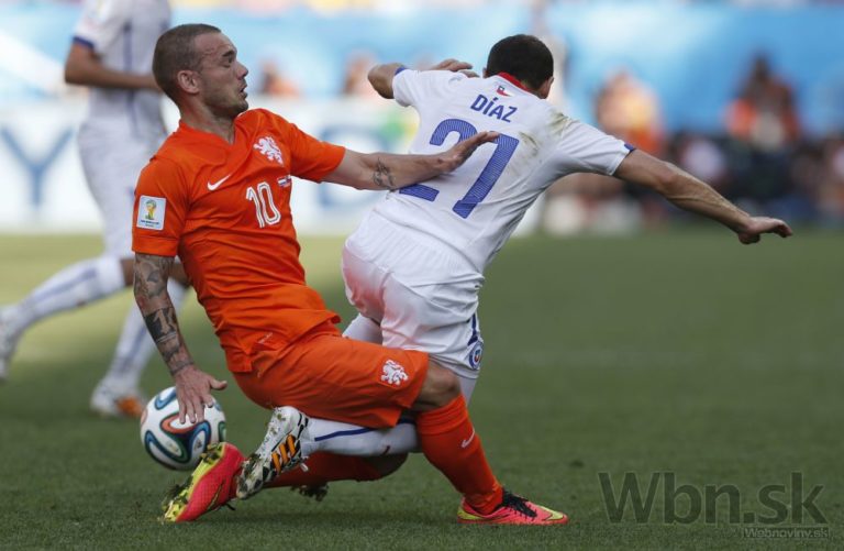 Holandský futbalista Wesley Sneijder v súboji s Čiľanom Marcelom Diazom počas pondelňajšieho zápasu B-skupiny na svetovom šampionáte v Brazílii. Foto: SITA/AP