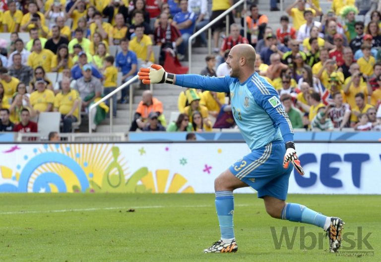 Španielsky brankár Pepe Reina gestikuluje so svojimi spoluhráčmi počas pondelňajšieho zápasu proti Austrálii na svetovom šampionáte v Brazílii. Foto: SITA/AP