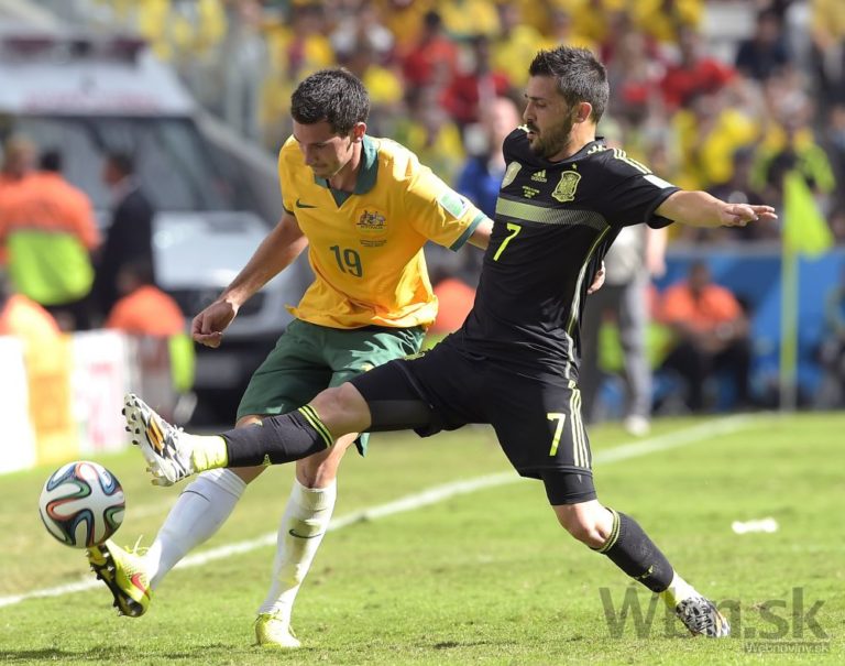 Austrálčan Ryan McGowan v súboji so španielskym futbalistom Davidom Villom počas pondelňajšieho zápasu B-skupiny na svetovom šampionáte v Brazílii. Foto: SITA/AP