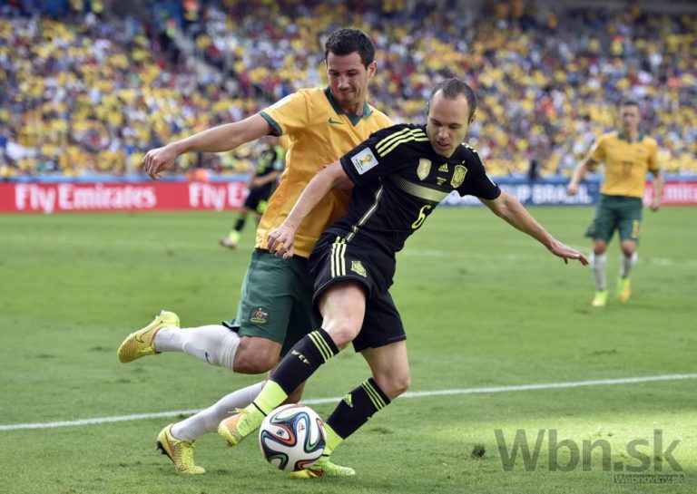 Austrálčan Ryan McGowan v súboji so španielskym futbalistom Andresom Iniestom počas pondelňajšieho zápasu B-skupiny na svetovom šampionáte v Brazílii. Foto: SITA/AP
