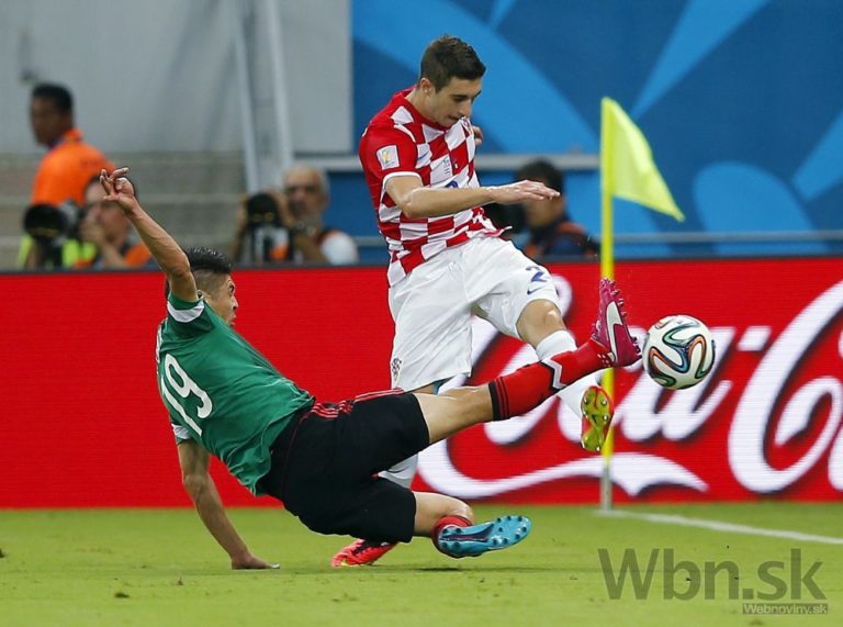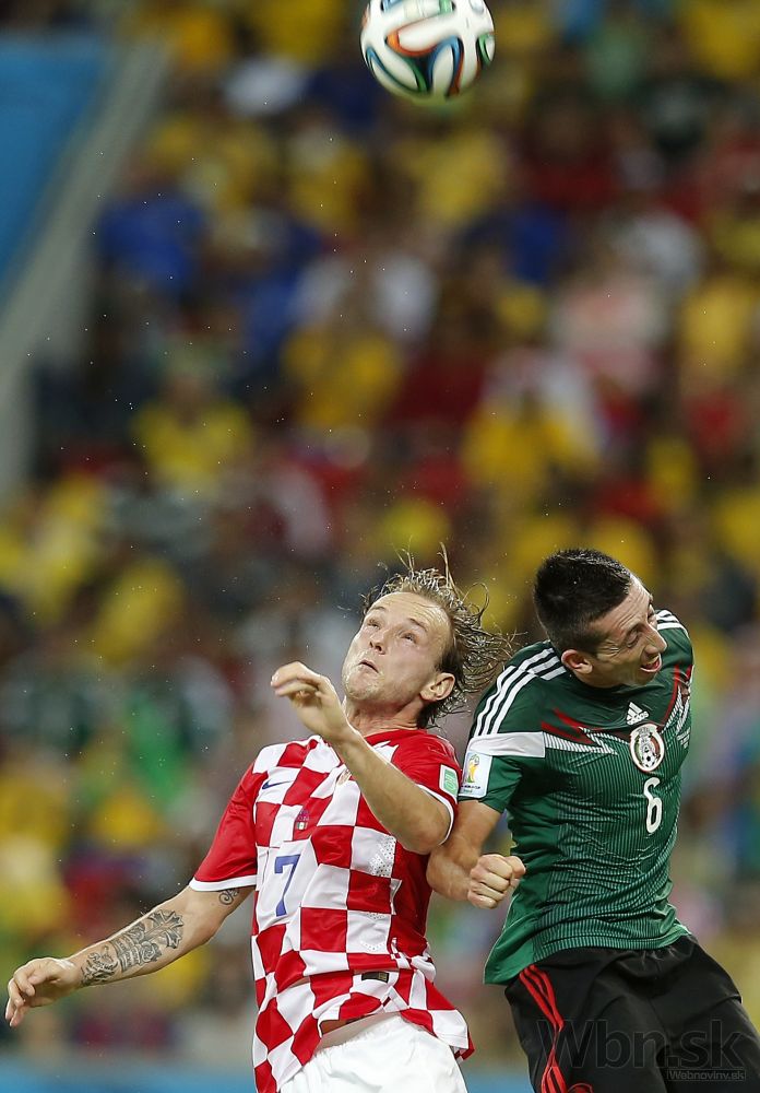 Chorvátsky futbalista Sime Vrsaljko v súboji s Mexičanom Oribem Peraltom počas pondelajšieho zápasu A-skupiny na svetovom šampionáte v Brazílii. Foto: SITA/AP
