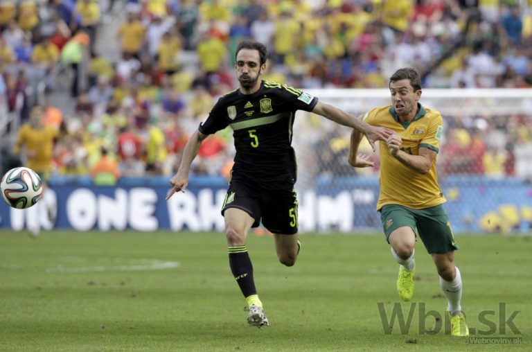 Austrálčan James Troisi v súboji so španielskym futbalistom Juanfranom počas pondelňajšieho zápasu B-skupiny na svetovom šampionáte v Brazílii. Foto: SITA/AP