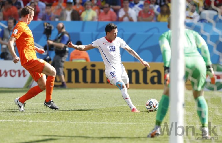 Čiľan Charles Aranguiz strieľa na holandského brankára Jaspera Cillessena počas pondelňajšieho zápasu B-skupiny na svetovom šampionáte v Brazílii. Foto: SITA/AP