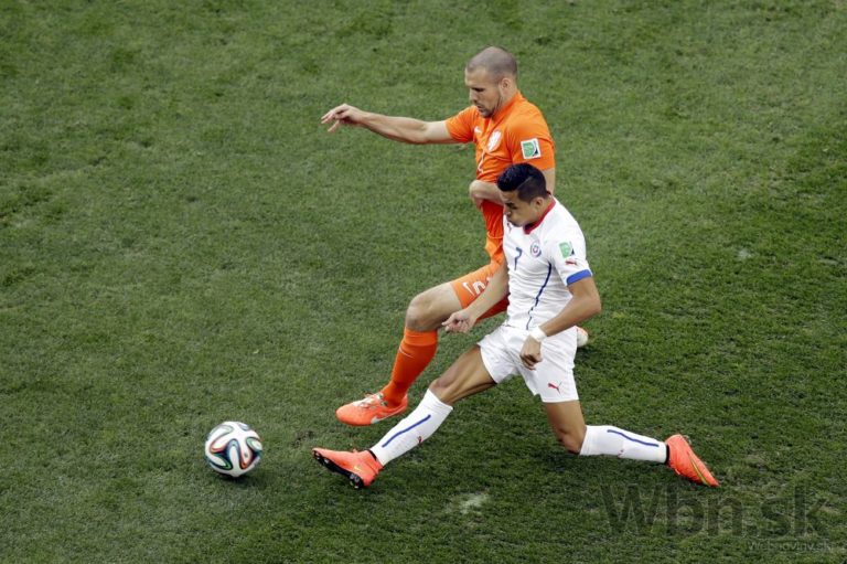Čiľan Alexis Sanchez (7) v súboji s holandským futbalistom Ronom Vlaarom počas pondelňajšieho zápasu B-skupiny na svetovom šampionáte v Brazílii. Foto: SITA/AP