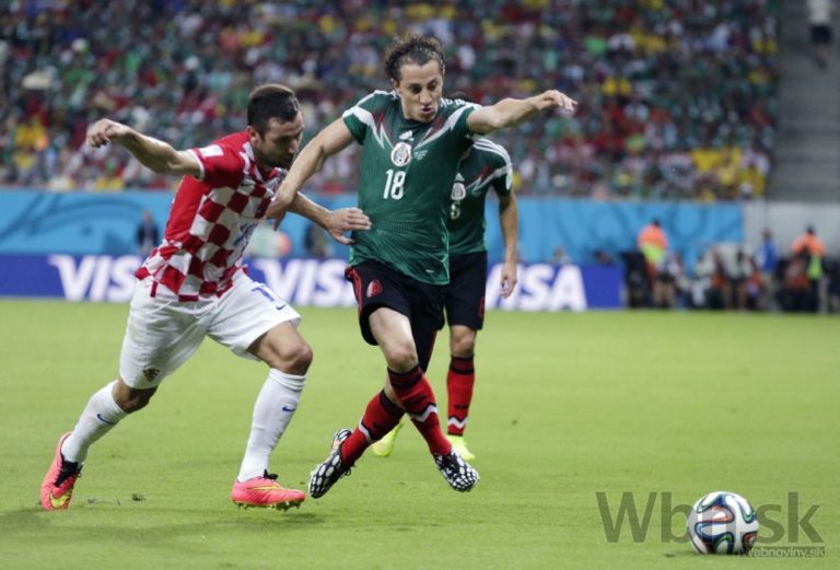 Mexičan Andres Guardado v súboji s chorvátskym futbalistom Darijom Srnom počas pondelňajšieho zápasu na svetovom šampionáte v Brazílii. Foto: SITA/AP