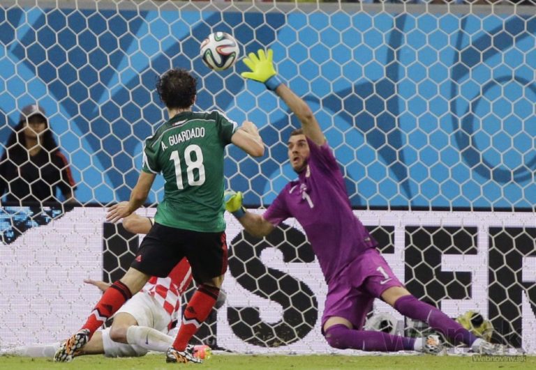 Mexičan Andres Guardado prekonáva chorvátskeho brankára počas pondelňajšieho zápasu na svetovom šampionáte v Brazílii. Foto: SITA/AP