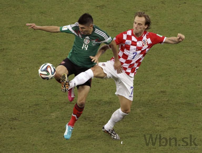 Mexičan Oribe Peralta v súboji s chorvátskym futbalistom Ivanom Rakitičom počas pondelňajšieho zápasu na svetovom šampionáte v Brazílii. Foto: SITA/AP
