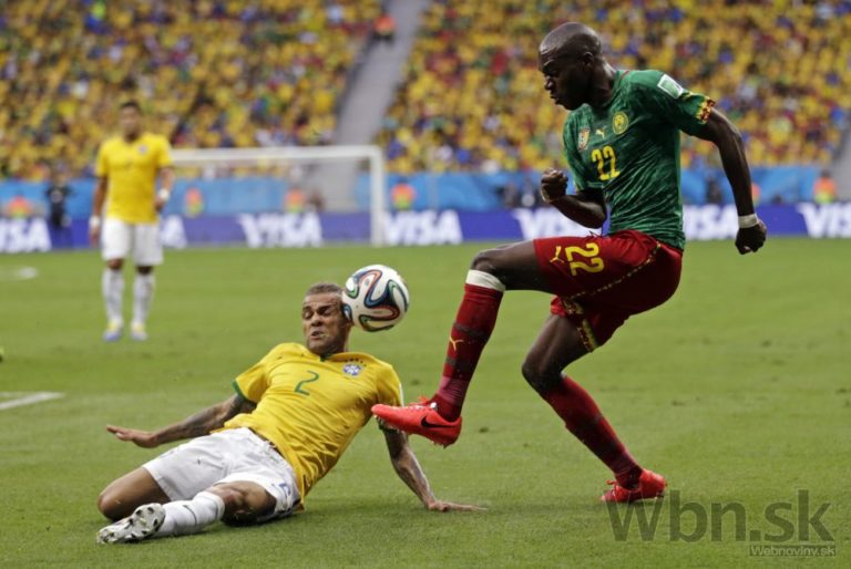 Kamerunčan Allan Nyom v súboji s brazílskym futbalistom Danim Alvesom počas pondelňajšieho zápasu A-skupiny na svetovom šampionáte. Foto: SITA/AP