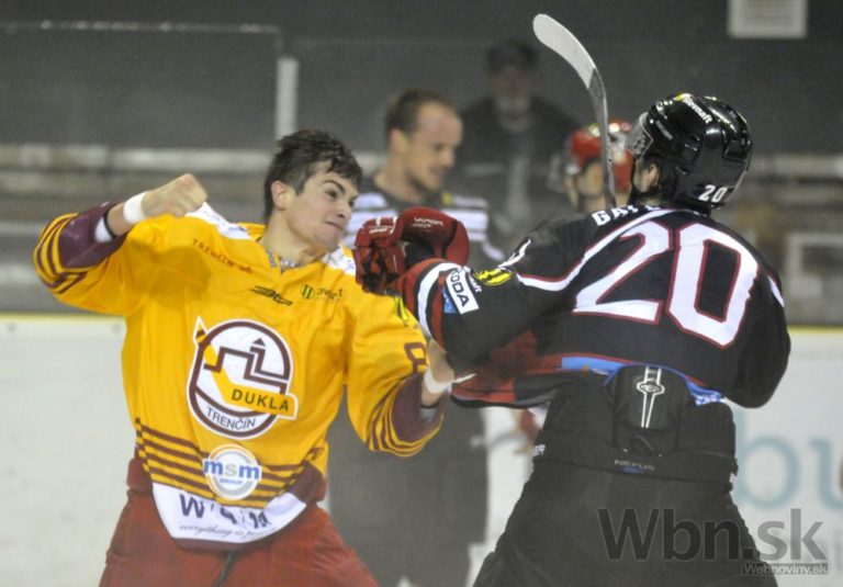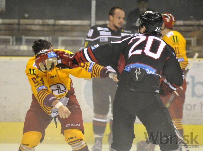 Zľava: Michal Hlinka z Dukly Trenčín a Peter Galamboš z HC ´05 iClinic Banská Bystrica v pästnom súboji počas zápasu 6. kola hokejovej Tipsport ligy medzi Dukla Trenčín - HC ´05 iClinic Banská Bystrica. Trenčín, 25. september 2015. Foto: SITA/Tomáš Somr