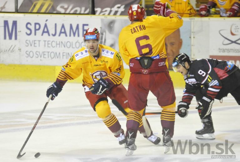 Zľava: Peter Ölvecký a Miroslav Zaťko z Dukly Trenčín a Juraj Majdan z HC ´05 iClinic Banská Bystrica počas zápasu 6. kola hokejovej Tipsport ligy medzi Dukla Trenčín - HC ´05 iClinic Banská Bystrica. Trenčín, 25. september 2015. Foto: SITA/Tomáš Somr