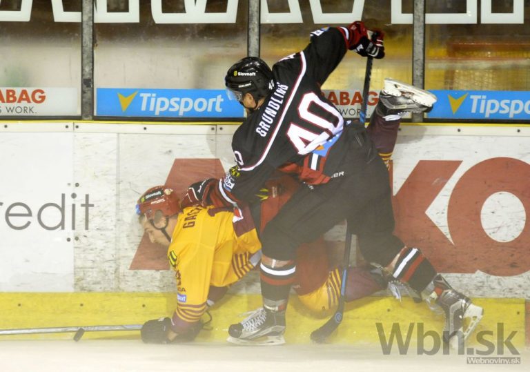 Zľava: Jakub Gašparovič z Dukly Trenčín a Martin Grundling z HC ´05 iClinic Banská Bystrica počas zápasu 6. kola hokejovej Tipsport ligy medzi Dukla Trenčín - HC ´05 iClinic Banská Bystrica. Trenčín, 25. september 2015. Foto: SITA/Tomáš Somr