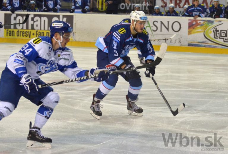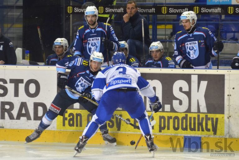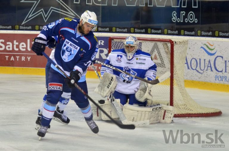 Dole zľava: Filip Bajtek z HK Nitra a Ján Ťavoda z HK Poprad počas hokejového zápasu 6. kola Tipsport ligy HK Poprad – Nitra. Poprad, 25. september 2015. Foto: SITA/Radoslav Maťaš