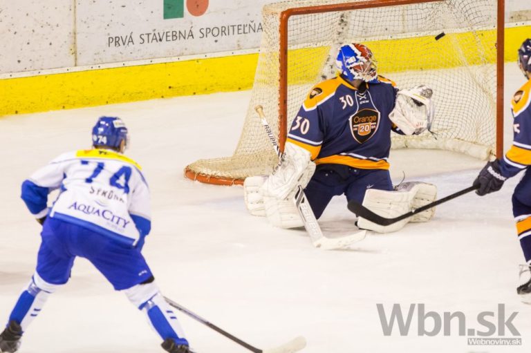 Zľava: Hráč Popradu Lukáš Paukovček a brankár Orange 20 Denis Godla počas 1. kola hokejovej Tipsport extraligy medzi HK Orange 20 a HK Poprad. Bratislava, 9. september 2014. Foto: SITA/Jozef Jakubčo