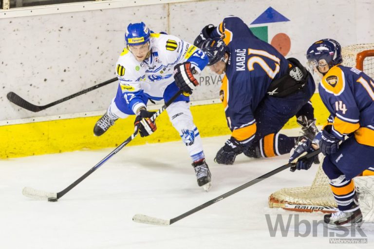 Zľava: Hráč Popradu Matúš Matis a hráč Orange 20 Michal Kabáč počas 1. kola hokejovej Tipsport extraligy medzi HK Orange 20 a HK Poprad. Bratislava, 9. september 2014. Foto: SITA/Jozef Jakubčo