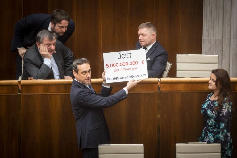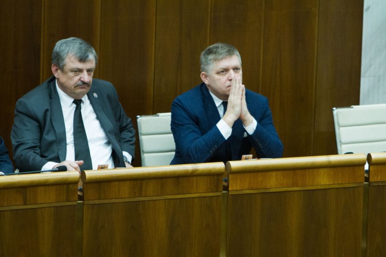 Zľava: Predseda NR SR Andrej Danko a poslanec NR SR Robert Fico pred začiatkom rokovania pokračujúcej mimoriadnej 58. schôdze Národnej rady SR. Foto: SITA/Branislav Bibel