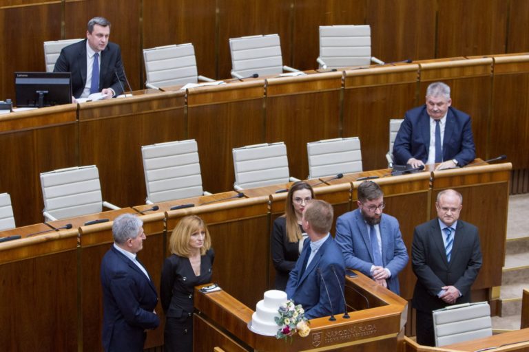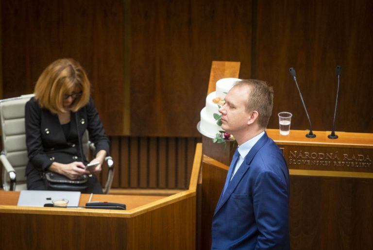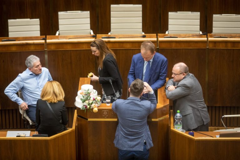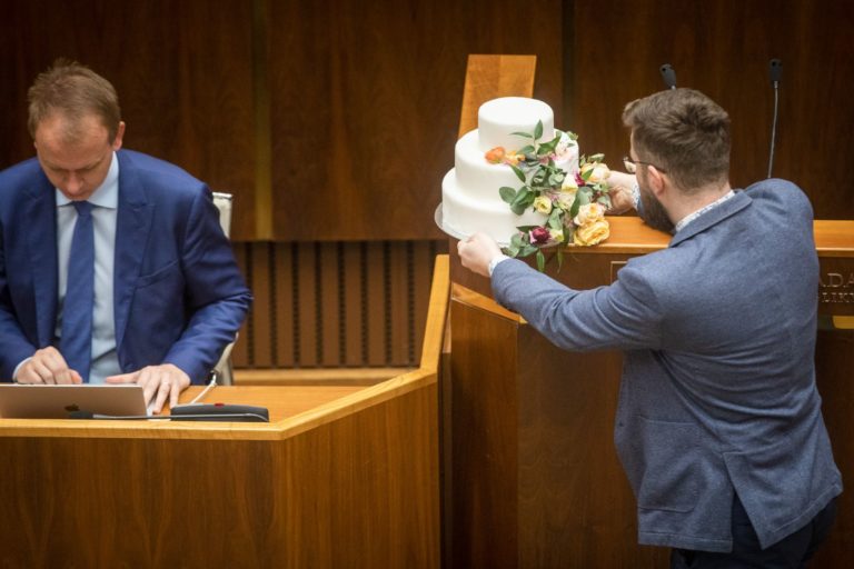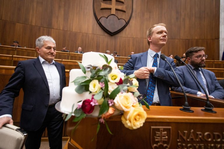 Zľava v popredí, poslanci parlamentu za stranu Spolu - občianska demokracia: Alan Suchánek, Miroslav Beblavý a Martin Poliačik priniesli svadobnú tortu ako symbol spolupráce medzi stranami SMER – sociálna demokracia a Kotlebovci – Ľudová strana Naše Slovensko počas rokovania mimoriadnej 58. schôdze Národnej rady SR. Bratislava, 18. február 2020. Foto: SITA/Branislav Bibel