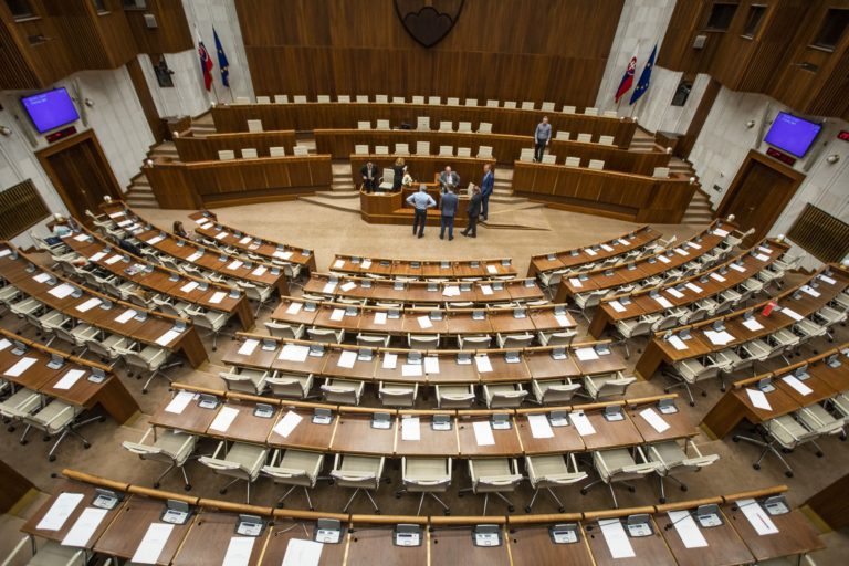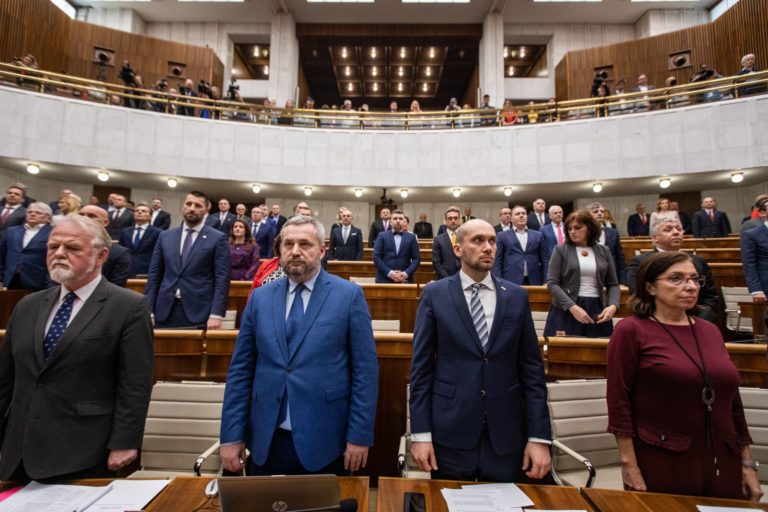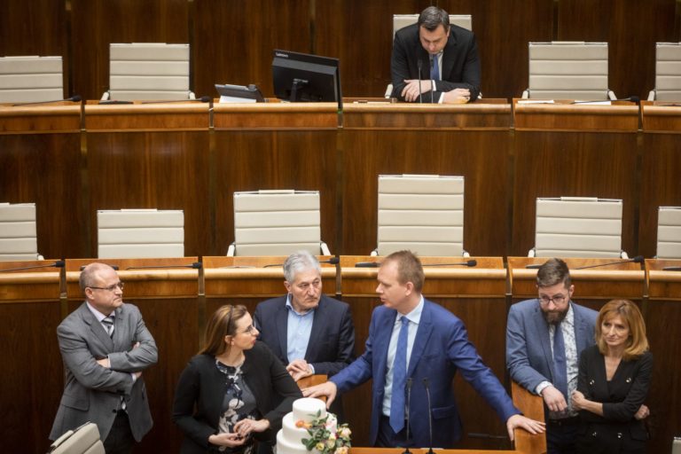 Opoziční poslanci NR SR (uprostred), ktorí noc strávili pri rečníckom pulte v pléne Národnej rady SR, čím chcú zabrániť otvoreniu rokovania mimoriadnej 58. schôdze Národnej rady SR. Bratislava, 19. február 2020. Foto: SITA/Branislav Bibel