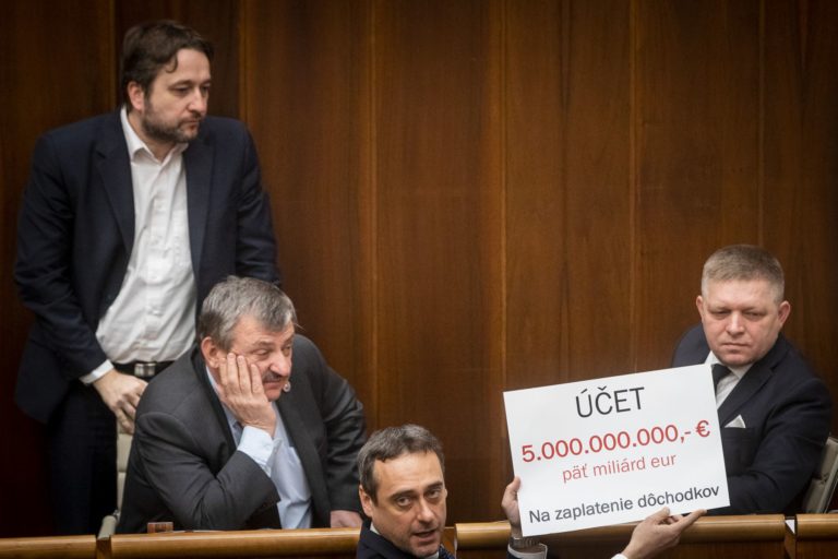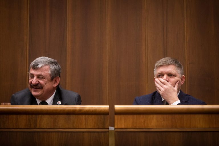 Zľava: Poslanec parlamentu za SNS Anton Hrnko a poslanec parlamentu za stranu SMER-SD Robert Fico počas rokovania mimoriadnej 58. schôdze Národnej rady SR. Bratislava, 18. február 2020. Foto: SITA/Ľudovít Vaniher
