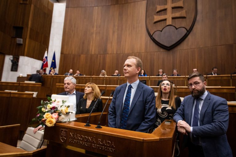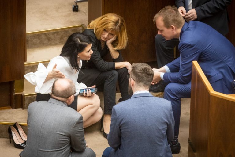 Poslanci NR SR Jozef Mihál, Jana Cigániková, Viera Dubačová, Martin Poliačik a Miroslav Beblavý pred začiatkom rokovania mimoriadnej 58. schôdze Národnej rady SR. Niektorí z nich strávili noc pri rečníckom pulte v pléne Národnej rady SR, čím chcú zabrániť otvoreniu rokovania mimoriadnej 58. schôdze NR SR. Bratislava, 19. február 2020. Foto: SITA/Branislav Bibel
