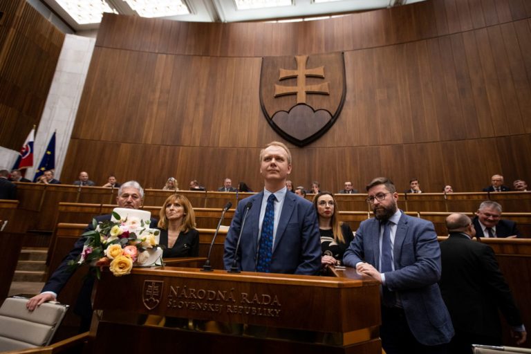 Poslanci NR SR Miroslav Beblavý a Martin Poliačik, ktorí noc strávili pri rečníckom pulte v pléne Národnej rady SR, čím chcú zabrániť otvoreniu rokovania mimoriadnej 58. schôdze Národnej rady SR. Bratislava, 19. február 2020. Foto: SITA/Branislav Bibel