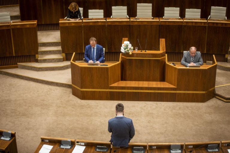 Zľava popredí: Poslanci parlamentu za stranu Sloboda a Solidarita (SAS) Peter Osuský, Ondrej Dostál, Karol Galek a Anna Zemanová počas rokovania mimoriadnej 58. schôdze Národnej rady SR. Bratislava, 18. február 2020. Foto: SITA/Branislav Bibel