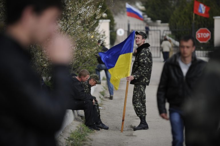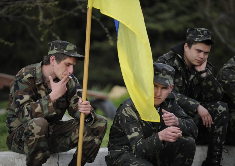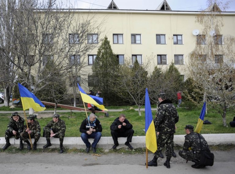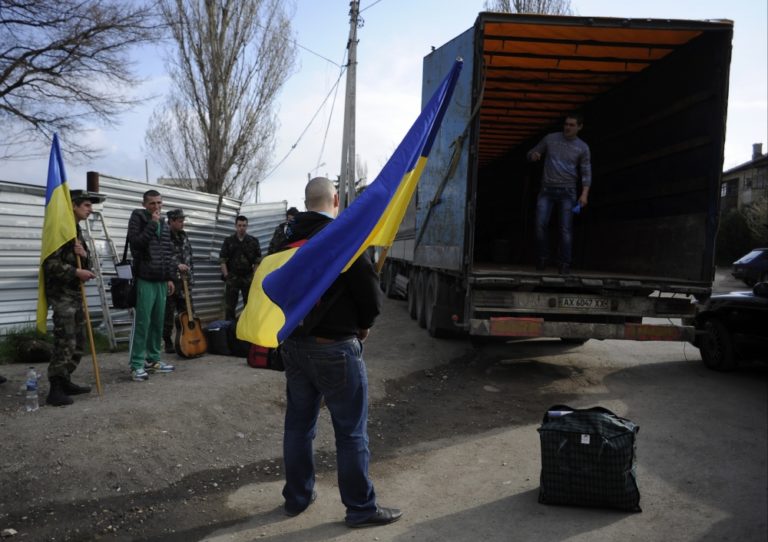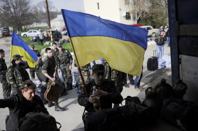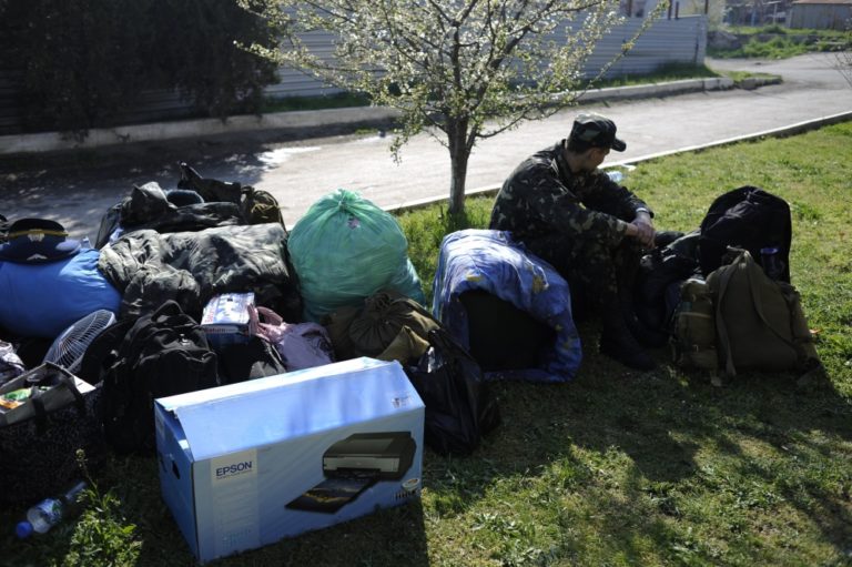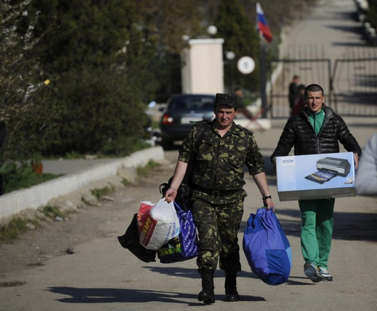 Vojaci opúšťajú základňu Belbek neďaleko Sevastopoľa. Foto: SITA/AP
