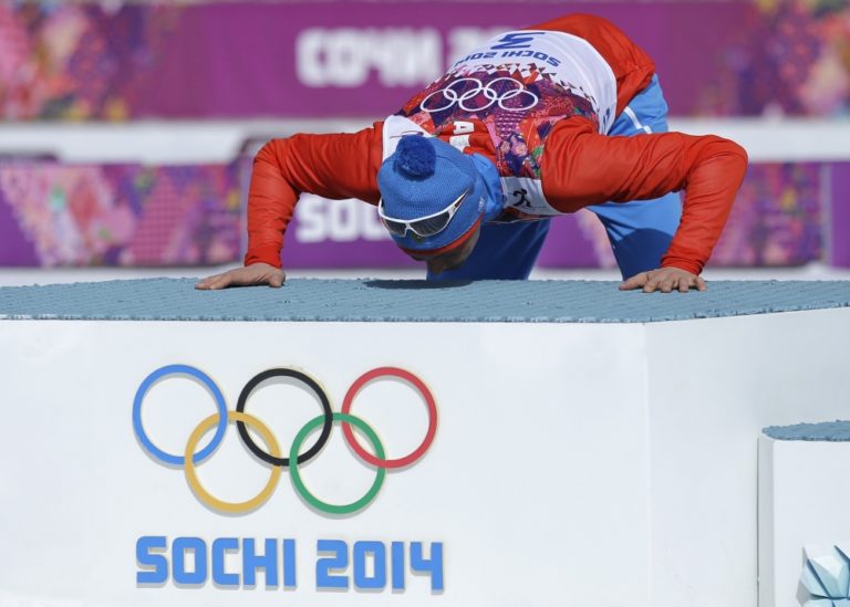 Rus Alexander Legkov bozkáva pódium po svojom víťazstve v nedeľňajších pretekoch na 50 kilometrov s hromadným štartom. Foto: SITA/AP
