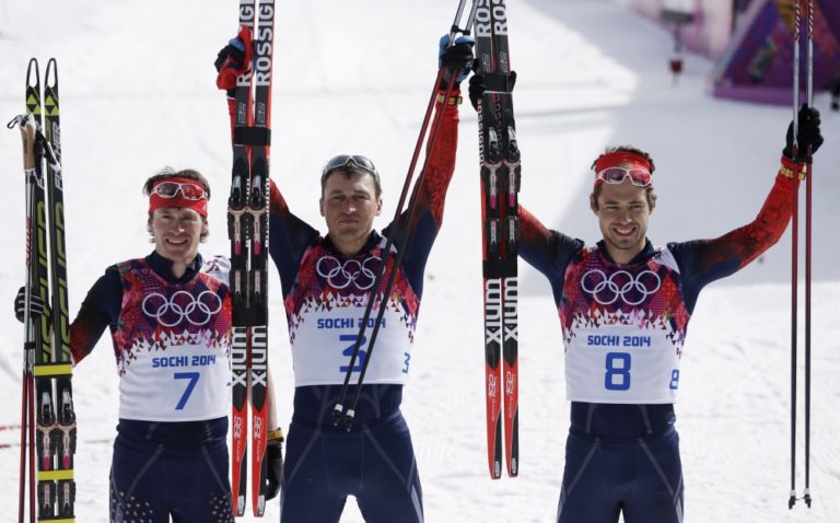 Zľava: Medailisti z nedeľňajších pretekov na 50 kilometrov voľnou technikou s hromadným štartom - Maxim Vylegžanin (striebro), Alexander Legkov (zlato) a Iľja Černousov (bronz) Foto: SITA/Jozef Jakubčo