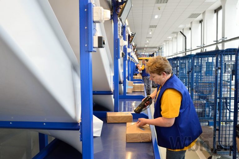Pracovníčka pošty počas slávnostného spustenia novej balíkovej triediacej linky Slovenskej pošty na Tomášikovej ulici v Bratislave. Bratislava 16.jún 2015. Foto: SITA/Robert Tappert